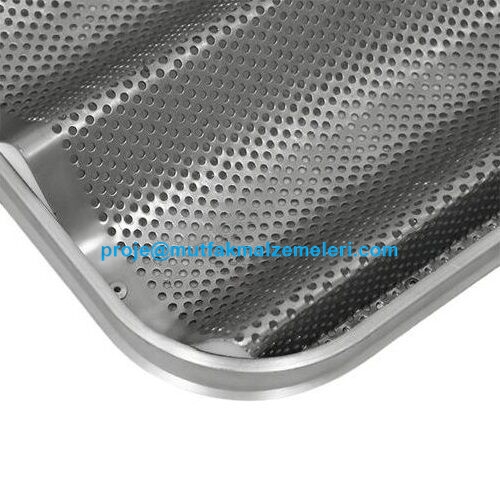 Delikli baget ekmeği pişirme tepsisinde boyuna 4 uzun tip baget ekmeği kalıbı vardır (kanal ölçüleri genişlik 75 mm yükseklik ise 30 mm ölçüsündedir)