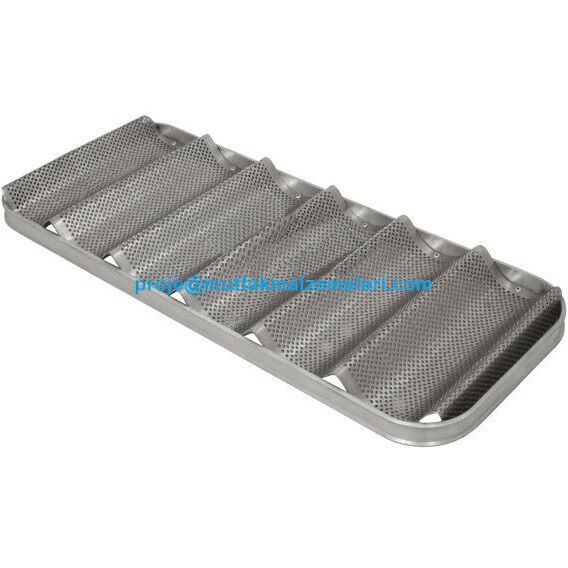 Delikli baget ekmek tepsisinde boyuna 5 kanallı baston ekmek pişirme yuvası vardır (kanal ölçüleri genişlik 70 mm yükseklik ise 30 mm ölçüsündedir)