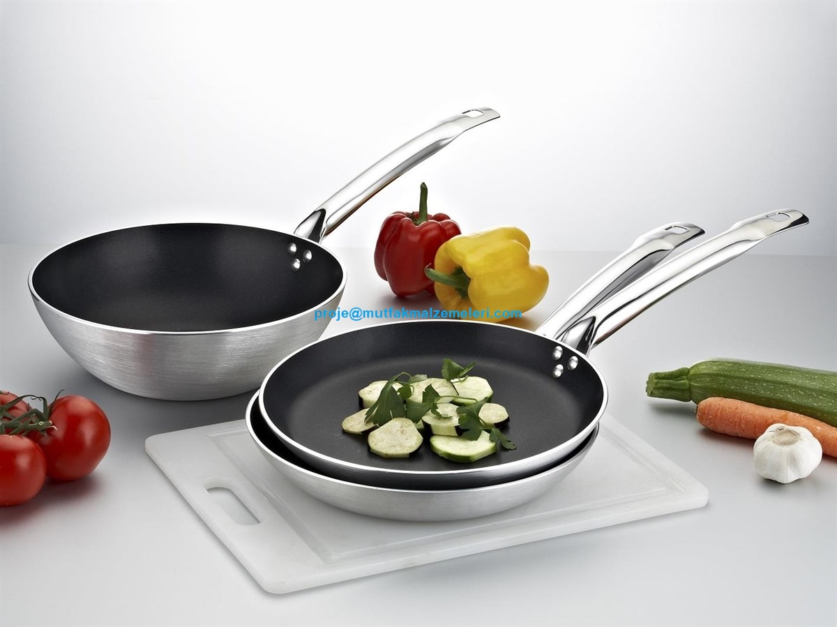 *3,5 mm ideal gövde kalınlığı, iç yüzeyde uygulanan profesyonel yapışmaz kaplama, zımparalı alüminyum dış yüzey, gövdeye özel alaşım perçinlerle sabitlenmiş ergonomik ve paslanmaz çelik boru saplara sahip bu seri, profesyonellerin tercihlerinin başında gelmektedir.