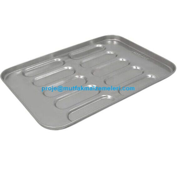 Preslenmiş alüminyum sandviç pişirme tepsisinde 6.5 x 18.5 ölçüsünde 60 gramlık kalıplarda 18 adet sandviç ekmeği pişirme kalıbı vardır