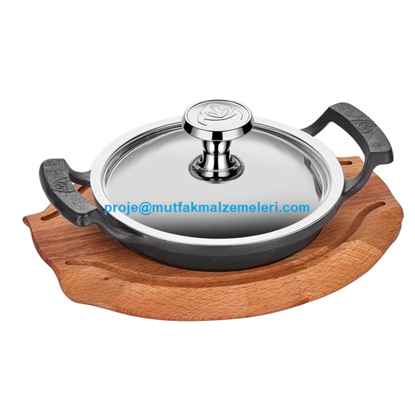 *Ø16cm. Yuvarlak, Sahan. *Döküm Demir Gövde, Kulplu. *1mm. İç Bükey Taban. *304 P.Çelik Kapak. *Ahşap Nihale. ÜRÜN TANIMI *Döküm Demir eski zamanlardan beri pişirme gereci olarak kullanılmaktadır.Demir Dökümün tercih edilmesinin başlıca sebebi,ısıyı iyi iletme özelliği ve uzun süre sıcak kalabilmesidir. *Son dönemlerde yemeğin masaya sıcak servis edilmesi ve daha uzun süre sıcak kalabilmesi konusundaki artan talepler doğrultusunda,Döküm Demirin sunumlarda da kullanılması yaygınlaşmıştır. *Döküm Demir serisi bu amaçla üretilmektedir ve birbirinden şık model,altlık ve kapak alternatifleri ile bu ihtiyacı karşılarken,Profesyonellere sunum şıklığı da sunmaktadır. KULLANIM VE BAKIM ÖNERİLERİ *Metal kaşık ve kesici aletler kullanmayınız. Tahta ve plastik türü karıştırıcılar tercih ediniz. *Ürünü yıkarken bulaşık teli ve sert bulaşık tozu kullanmayınız. Sıvı veya krem deterjan kullanınız. *Bu önlemler ürünün ömrünü uzatır.