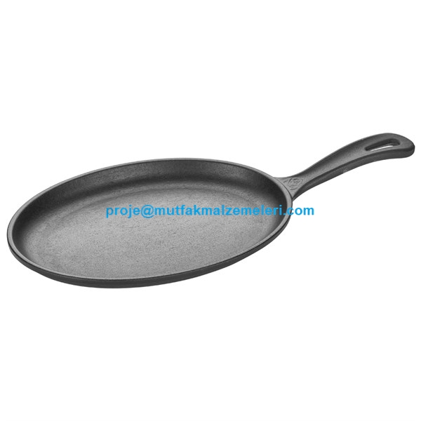 *24*17cm. Oval, Fajita Tava. *Döküm Demir Gövde, Saplı. *Çemberli Düz Taban. ÜRÜN TANIMI *Döküm Demir eski zamanlardan beri pişirme gereci olarak kullanılmaktadır.Demir Dökümün tercih edilmesinin başlıca sebebi,ısıyı iyi iletme özelliği ve uzun süre sıcak kalabilmesidir. *Son dönemlerde yemeğin masaya sıcak servis edilmesi ve daha uzun süre sıcak kalabilmesi konusundaki artan talepler doğrultusunda,Döküm Demirin sunumlarda da kullanılması yaygınlaşmıştır. *Döküm Demir serisi bu amaçla üretilmektedir ve birbirinden şık model,altlık ve kapak alternatifleri ile bu ihtiyacı karşılarken,Profesyonellere sunum şıklığı da sunmaktadır. KULLANIM VE BAKIM ÖNERİLERİ *Metal kaşık ve kesici aletler kullanmayınız. Tahta ve plastik türü karıştırıcılar tercih ediniz. *Ürünü yıkarken bulaşık teli ve sert bulaşık tozu kullanmayınız. Sıvı veya krem deterjan kullanınız. *Bu önlemler ürünün ömrünü uzatır.