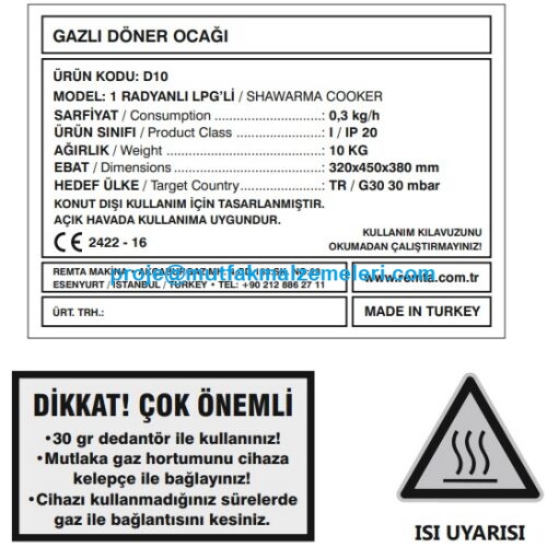 Döner salonları, lokantalar ve büfeler için özel olarak üretilen 5 Radyanlı Gazlı Döner Ocağı (D10), etinizi kurutmadan, dışı çıtır içi sulu kalacak şekilde pişirmek için tasarlanmıştır. Tamamı paslanmaz çelik gövdeden oluşan yapısı, yoğun kullanım şartlarına ve yüksek ısıya karşı ekstra dirençlidir. Telefon: 0212 237 07 49