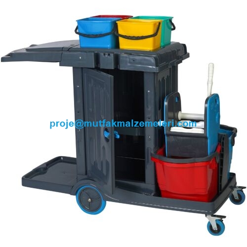 Ölçüleri 140x53x100 cm olan Malzeme Dolaplı Kat Arabası, temizlik işlemleriniz için ideal bir yardımcıdır. Telefon: 0212 237 07 49