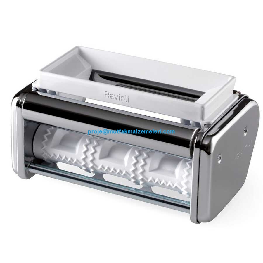 Atlas 150 ile birlikte gelen kesme aksesuarını çıkarın ve yerine ilgili talimatları takip ederek ravioli aksesuarını takın, beyaz renkli dolgu aparatını çıkartın.