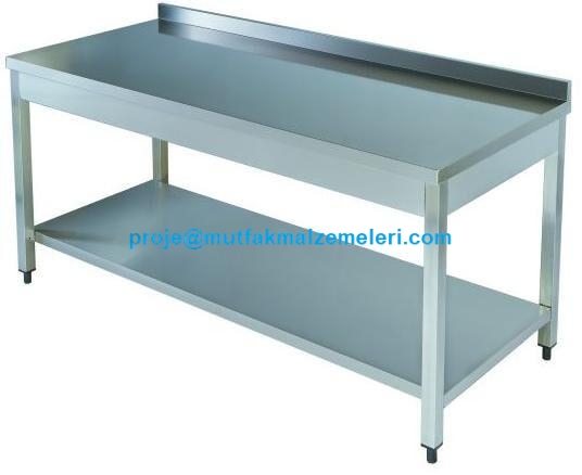Mutfak Tezgahı TA609D:Sanayi tipi mutfak tezgahlarından endüstriyel mutfak tezgahlarından olan bu alt raflı mutfak tezgahının imalatı paslanmaz çelikten yapılmış olup; yemekhane mutfaklarında hazırlık tezgahı kasaplarda et kesme tezgahı restoranlarda yemek hazırlama mutfak tezgahı olarak kullanılmaktadır - Mutfak tezgahı