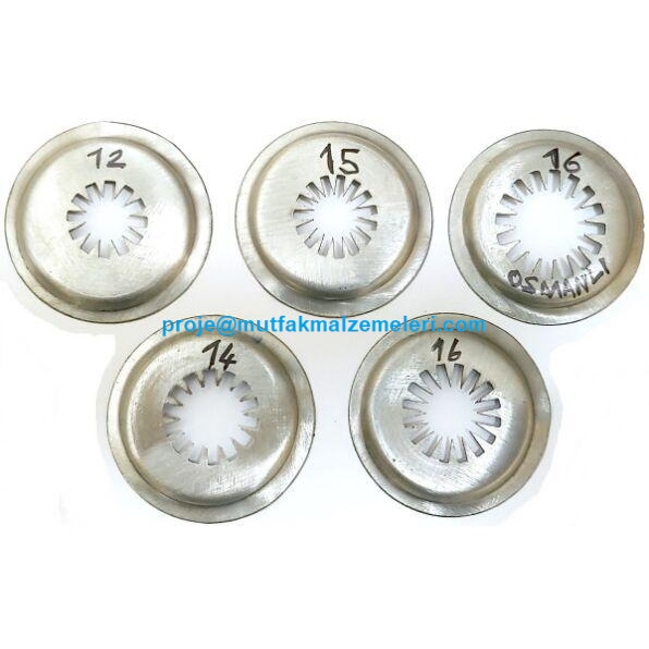 Bıçakcı, Topçu, Empero, Topaloğlu gibi önde gelen markaların tulumba tatlısı makinaları ile uyumlu, paslanmaz çelikten imal edilmiş Osmanlı Tulumba Tatlı Yıldızı Kalıbı ile geleneksel lezzeti büyük boyutta sunun. Bu yeni model 16 dişli kalıp, makinenizin performansını en üst seviyede tutarak mükemmel şekilli Osmanlı tulumba tatlıları üretmenizi sağlar. Telefon: 0212 237 07 50